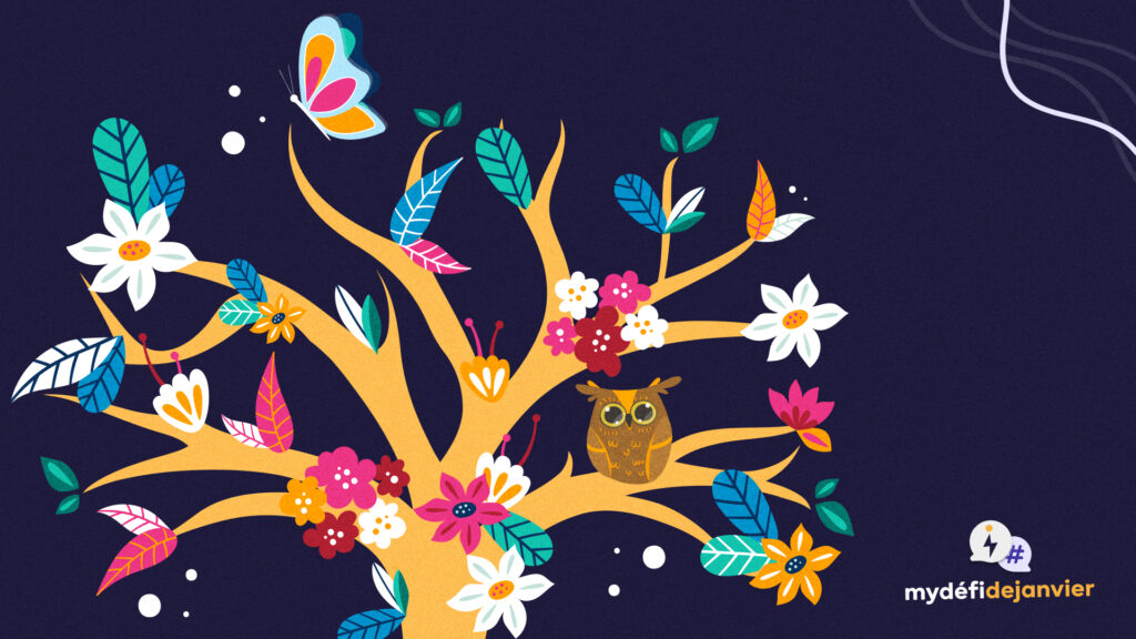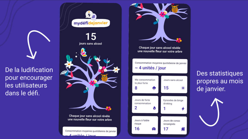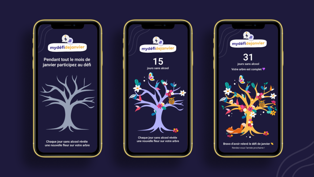 Du 1er au 31 janvier, chaque jour sans alcool renseigné fait apparaître une fleur ou un animal dans l’arbre. Le tronc évolue avec trois changements de couleur progressifs, et le remplissage se fait en éventail, semaine après semaine.